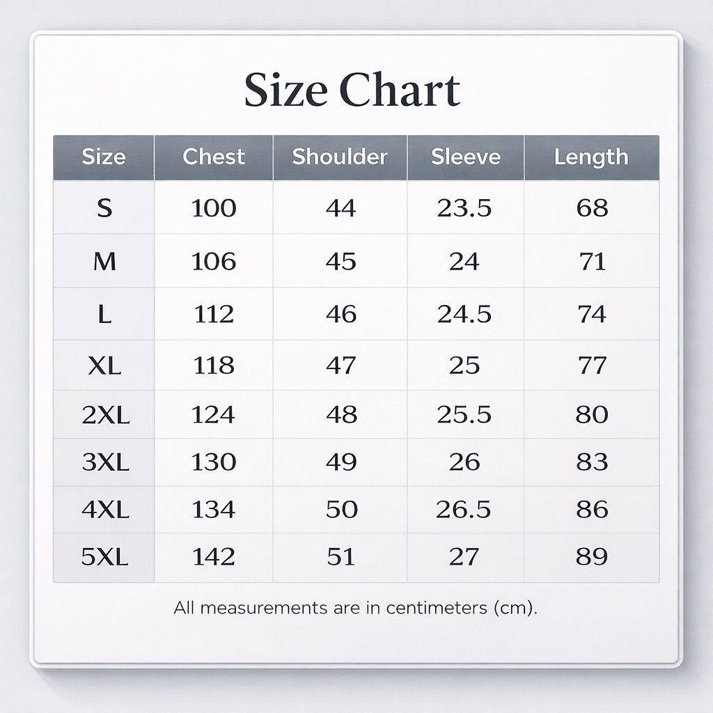 • Size Guide: Choose a size based on your preference for a relaxed or tailored fit.
